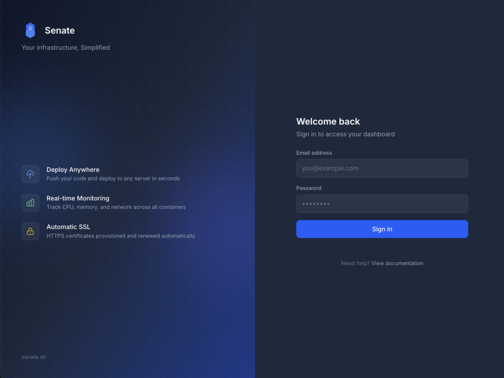 Senate is a self-hosted alternative to Heroku, Vercel, and Railway. Run your apps on any server you control with automatic HTTPS, real-time monitoring, and a beautiful dashboard.